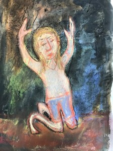 Prompt: While listening to music that evokes humanity’s shared experience of suffering, create a small pencil drawing of a figure symbolic of spiritual healing. Place this drawing under a Gelli Plate, and using printmaking inks create a monotype and ghost print. When dry, add paint, drawing, embellishments.